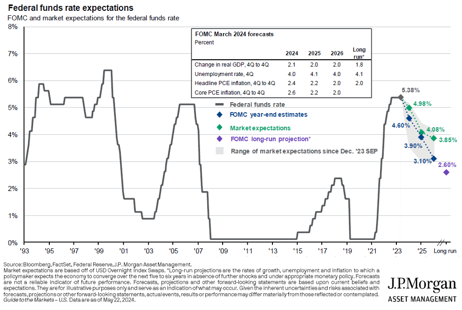 As we evaluate the chess board, it simply seems to be a matter of time before interest rates head lower. The market is fixated on timing, ruminating over whether a cut will happen in June, July, or September (our bet is September for reference). We think that is missing the metaphorical forest for the trees. The key question is not when it happens, it is if it happens. We believe rate cuts will happen. And by the way, we aren’t out on a limb. The Federal Reserve makes public its own prediction for forward interest rates. As you can see with the blue diamonds below, the Fed sees rates heading significantly lower in future periods.