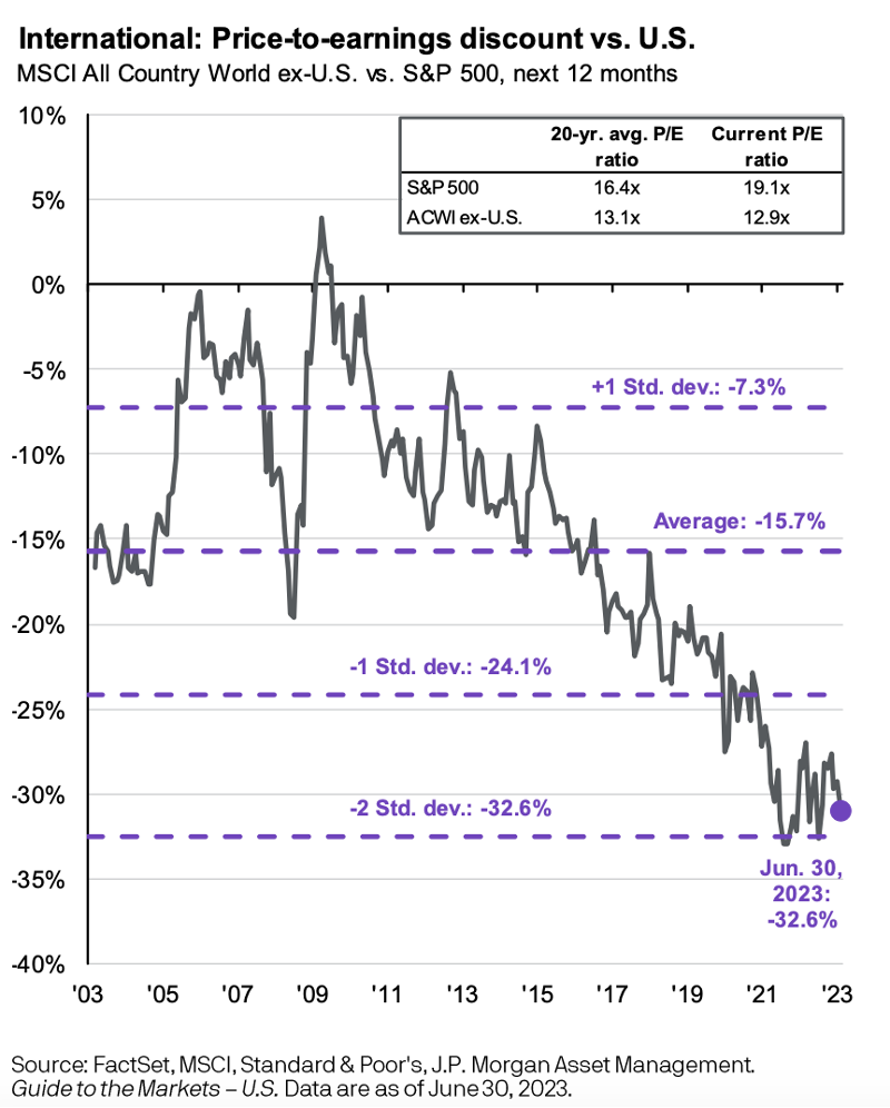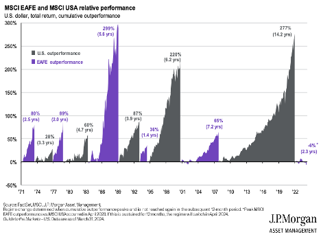 As you can see from the following illustration, clearly the US has enjoyed a massive amount of outperformance relative to broader international markets. Cumulatively, the US has outperformed international markets by 277% in the last 14.