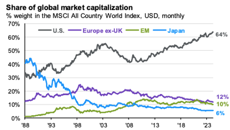 As a result of this outperformance, the total size of the United States stock market has risen to 64% of total equity capitalization worldwide. This is an extreme figure.