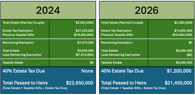 As you can see, by gifting the additional $19 million, it has no impact on the estate taxes in 2024 & 2025, but we were able to save $2,260,000 in estate taxes in 2026 assuming the sunset occurs. This provides The Jensen’s heirs and/or charities with $21,450,000 instead of $19,190,000 by taking advantage of the larger exemption that may go away in 2026.
