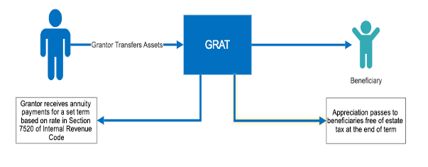 - Grantor Retained Annuity Trusts (GRATs) – A GRAT is a special type of irrevocable trust that allows the trustmaker/grantor to gift assets that are expected to appreciate in value to a trust and in return, the trust pays him/her a fixed dollar amount (annuity) each year for the term of the trust. At the end of the term of the GRAT, the trust terminates and the remaining assets will be distributed to the individuals or trusts you have named as remainder beneficiary. Because you may serve as Trustee, creation of a GRAT allows you to retain control and use of your property while transferring the property’s upside appreciation to the remainder beneficiaries tax-free. The term of the GRAT may be for life or any period of time, not less than two years, that you determine at the inception of the GRAT. If you die during the GRAT term, the GRAT assets will be included in your estate for federal estate tax purposes.