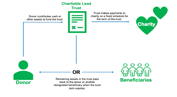 - Charitable Lead Trusts (CLTs) – CLTs operate for a set term, which could be the life of one or more individuals, and payments are made to one or more designated charitable beneficiaries for that time period. After the end of the trust term, the remainder of the trust is distributed to non-charitable beneficiaries—such as family members. It can potentially provide benefits such as an income tax deductions or estate or gift tax savings on assets ultimately passed to the individuals designated as remainder beneficiaries.