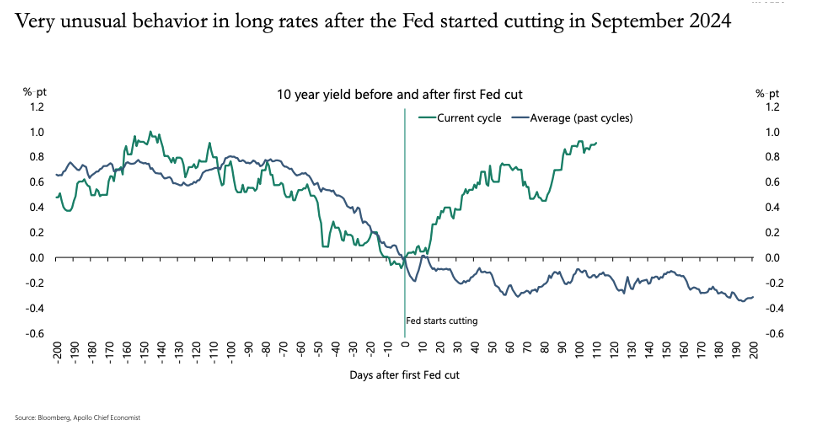 A strange phenomenon has presented itself lately in the fixed income market. Traditionally, when the Federal Reserve starts cutting rates, yields on virtually all maturities start to ratchet downward. The blue line in the following Apollo illustration represents the average movement of the 10-year U.S. Treasury Bond yield during past easing cycles. The green line, by contrast shows what has happened this cycle. Rather than move lower, yields on longer dated maturities have raced higher. What is causing this, and can it persist? There appears to be a broad-based belief that U.S. economic growth is going to reaccelerate, inflation is going to stay persistently high, exacerbated by tariffs, and that the potential tax cuts and other fiscal stimulus measures planned by the Trump administration will continue to grow the Federal deficit. The irony in this thinking, however, is that higher longer-term interest rates act as a major impediment to economic growth. Home, automobile, and other large capital goods (furniture, appliances, electronics) purchases become much less affordable in high-interest rate environments. Similarly, corporations rethink longer term capital projects as the investment hurdle rate climbs. It is our belief that higher growth and higher for longer interest rates are inconsistent with one another and cannot coexist for long. Something must give.