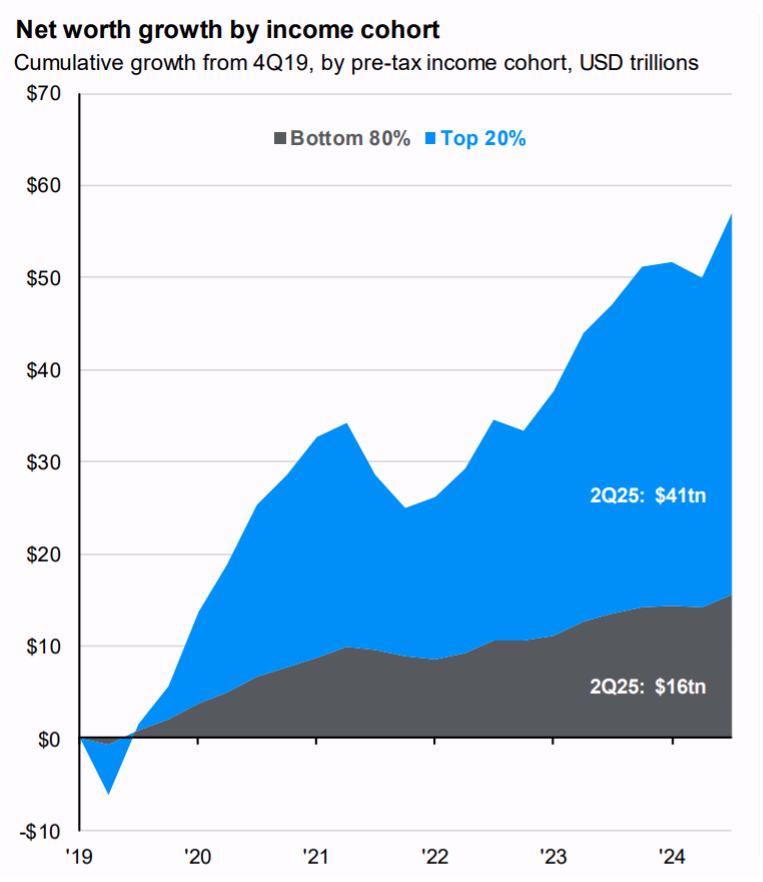 While this is occurring, the job market is weakening. Job growth is no longer keeping pace with labor force growth. Goldman Sachs estimates that the U.S. needs to create roughly 70k jobs per month to keep the unemployment rate steady. Unfortunately, we have fallen short of target in five of the last 7 months. Meanwhile, the unemployment rate has been on a steady rise, climbing from 4.1% in June 2025 to 4.6% in the latest November report. If this trend does not reverse, ultimately corporations will start to feel the pinch. They will lay off more workers and eventually the higher end consumer will retrench.