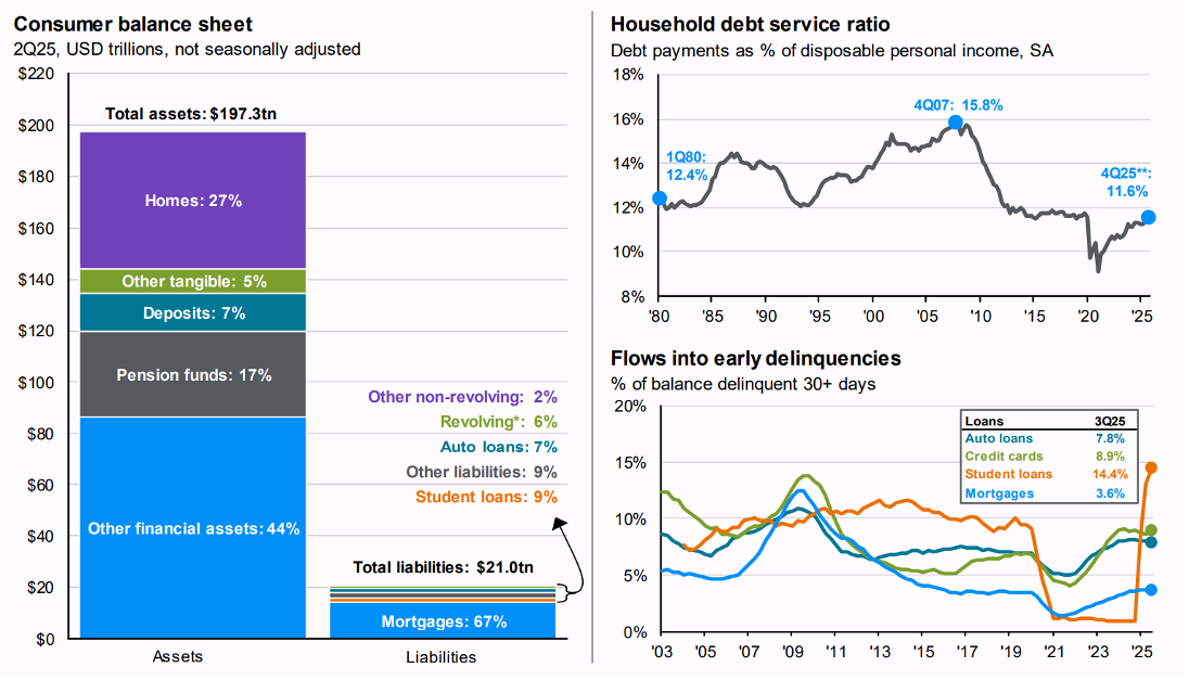 Thus, when we look at the aggregate consumer balance sheet on the left below, it looks quite healthy. Assets dwarf liabilities. However, the bifurcation shown above illustrates that most of the asset column belongs to higher income cohorts while a considerable piece of the liability side belongs to lower income cohorts. That is where the pain is being felt as household debt service climbs and delinquencies on auto loans, credit cards, student loans, and mortgages are rising.