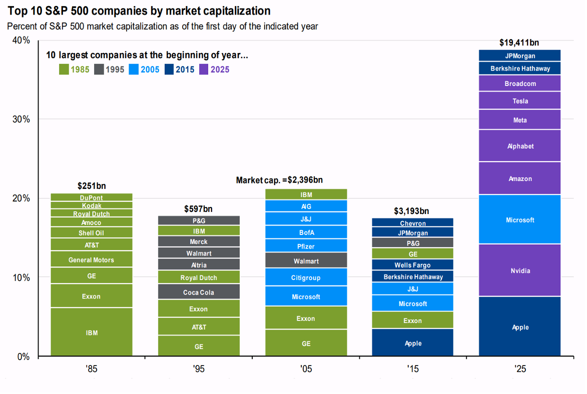 Finally, let’s turn the turret to market composition and returns. Interestingly, the stock market has taken on much the same complexion as the economy. Seven companies within the S&P 500 account for 36% of its market capitalization. They are collectively responsible for 50% of the growth in earnings for the entire index in 2025. Similarly, we see it in performance. While the market capitalization weighted S&P 500 index was up 17.75% in 2025, the equal weighted S&P 500 was up 11.22%. Said differently, the largest constituents in the S&P 500 index are driving the bulk of the returns. Much like the economy, the stock market is divided into haves and have nots. Technology firms at the heart of the AI capital expenditure cycle are the engine of market strength. Again, this begs the question of why is this a problem? At the moment, it isn’t. However, history tells us that market dominance is typically fleeting. The following illustration shows the largest companies in each of the past five decades. What you will see is that change is constant. However, unlike the previous four decades when the top ten companies represented roughly 20% of market capitalization, the top ten companies have ballooned to roughly 40% of the index today. Said differently, more of your eggs are in the same basket.