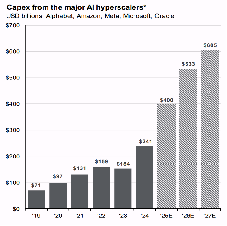 When we turn to capital investment, we see a feeding frenzy of spending in AI. Collectively over $1 trillion has been spent by five companies alone in the past five years. If forecasts prove accurate, that number could more than double in the next two years.