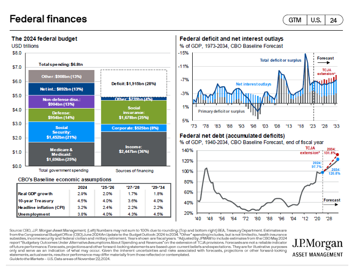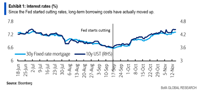 Finally, on the monetary side of the equation, Trump enters with an accommodative Federal Reserve, a major positive. The Federal Reserve has been lowering short-term interest rates (a total of 75 basis points thus far) since September 2024. Bank loans, most credit card interest rates, and many other forms of corporate credit are benchmarked to short term interest rates. That will reduce pressure on consumers and corporations alike. However, this is not a purely virtuous story. While short-term interest rates are coming down, fears of loose fiscal policy and less corporate tax revenues are driving long-term interest rates up. In other words, the work that the Federal Reserve is doing to accelerate economic conditions is being undermined by fears of rising federal debt. Buying a home, a car, or other big ticket durable goods is getting more expensive, not cheaper.